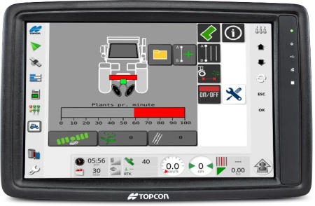 Topcon bietet drei Optionen für den Pflanzvorgang: Die Applikation im Stand, manuell bei fahrender Maschine bis hin zu hydraulisch bei fahrender Maschine. Die Software läuft unter im UT auf jedem standardmäßigen ISOBUS-Display sofern NMEA2000 und Rapid Update gewährleistet sind.