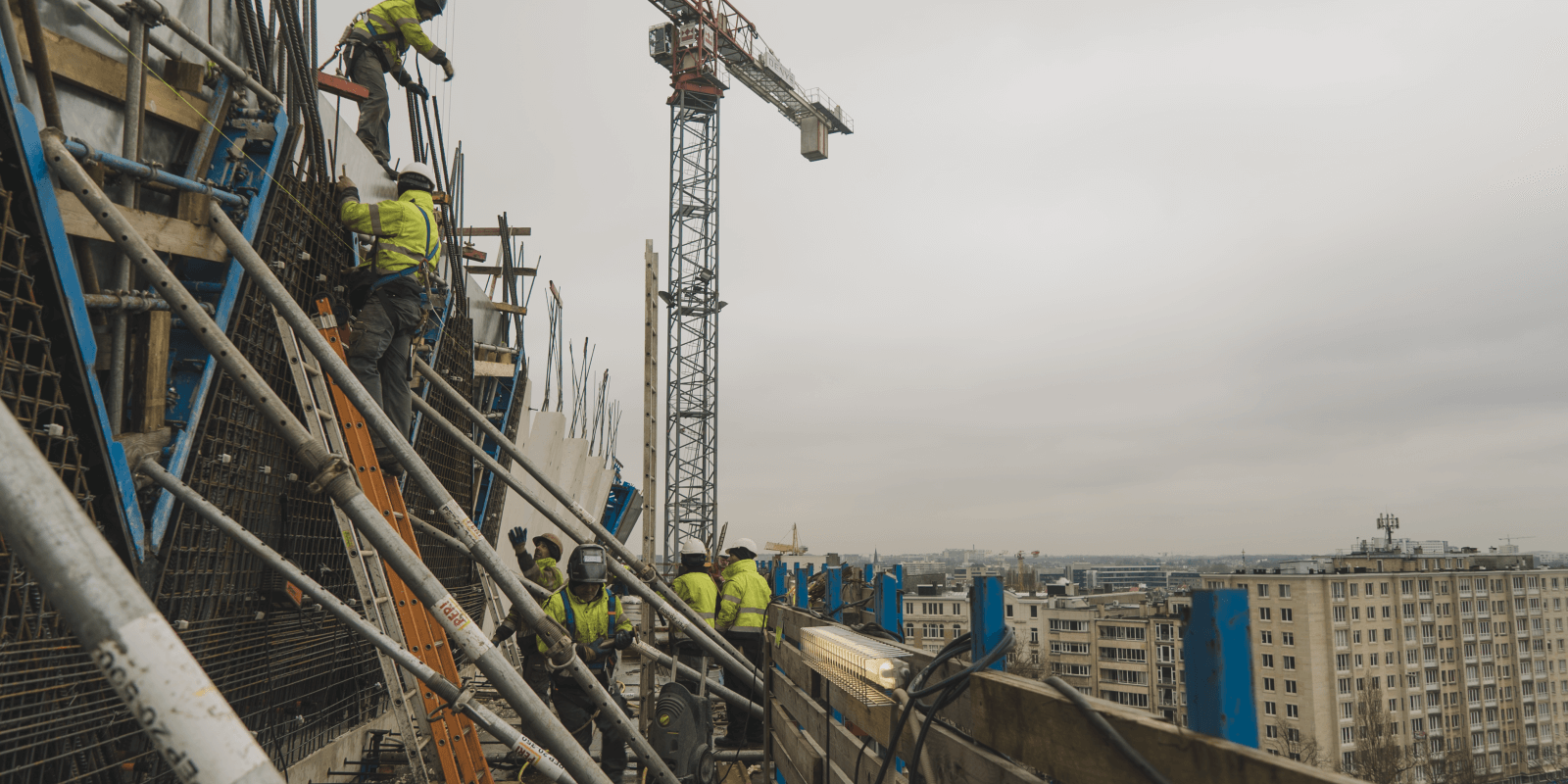 « Nous ne pouvons pas nous permettre la moindre erreur avec ces murs en béton », explique Rik Rieberghs. « C'est pourquoi un géomètre est présent sur le chantier à chaque instant : lors du montage des coffrages, du placement des fenêtres, etc. Il doit garder un œil sur l'ensemble du procédé afin de nous permettre d'atteindre une précision optimale. »