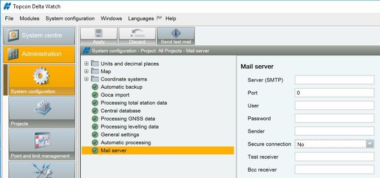 If you are using DW to send report alarms or warnings of any kind using email, then the email server settings need to be entered again. This might also be a good time to change the email account if you want to use a more secure email connection method. The settings can be found under Administration > System configuration > Mail server.