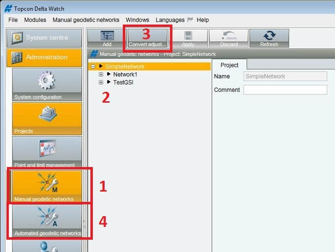 - Navigate to Administration > Manual geodetic networks. (item 1 in image below)