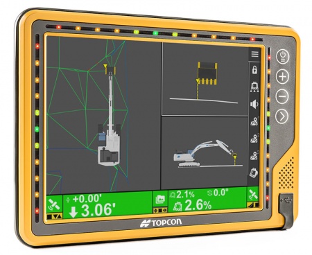 The bright and robust GX-75 delivers the highest quality, graphical interface experience for modern machine control.  The GX-75 also includes LED light bars that allow operators to easily see where they are in relation to grade. It includes an adjustable mounting backpack designed to provide versatility — whether an operator prefers to view project information on the left, right or center of the cab.