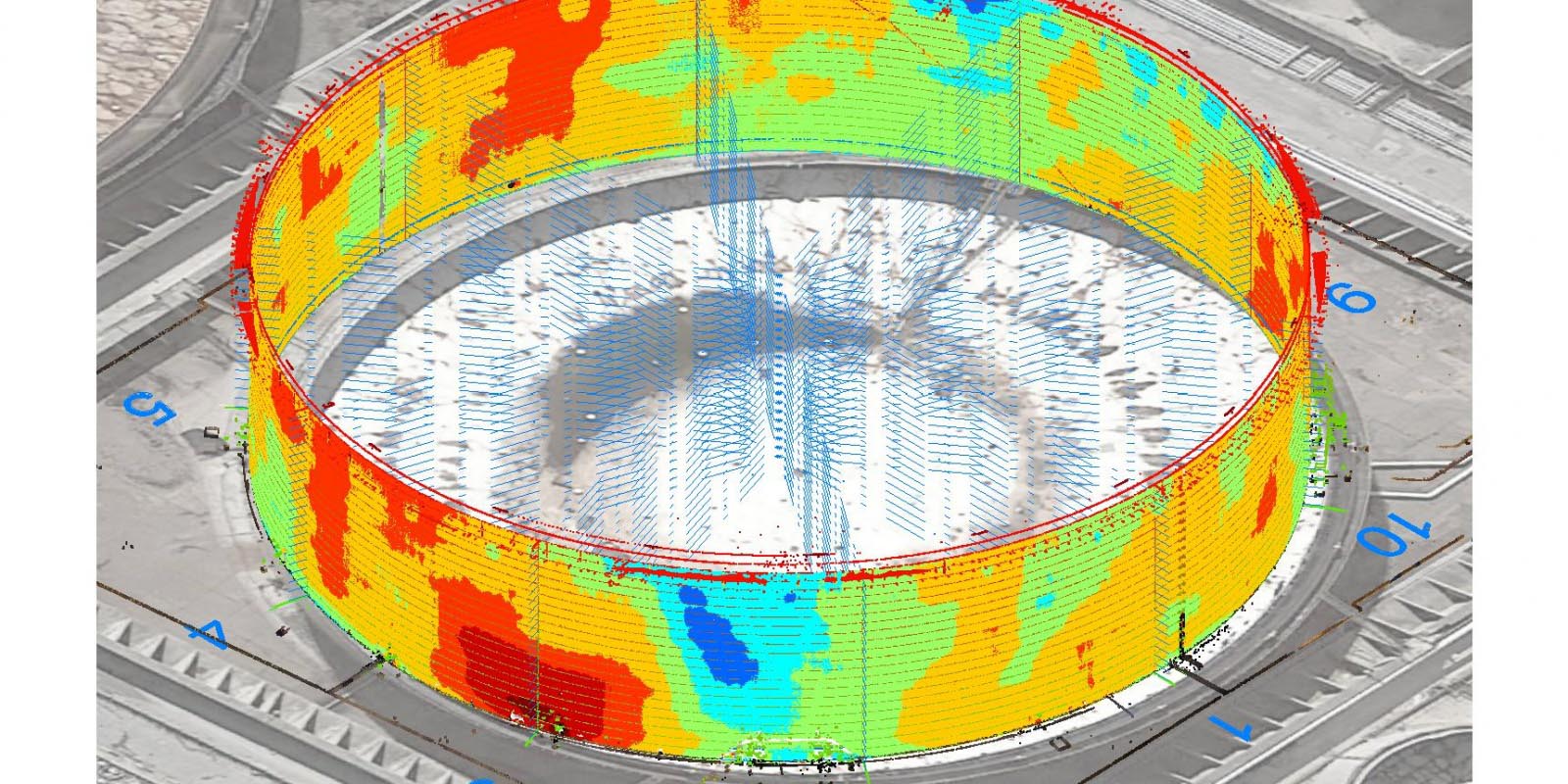 M. G. Salvucci: “la nuvola discreta di punti è stata elaborata al fine dell’ottenimento di valori numerici di deformazioni subite dal serbatoio in termini di ovalizzazione, cedimenti fondali e alterazione della verticalità.