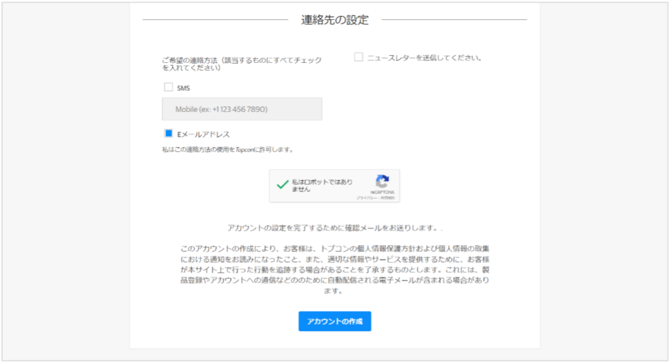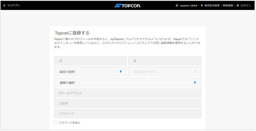 ② TOPCON アカウントに登録する情報を入力します。全ての項目を入力してください。